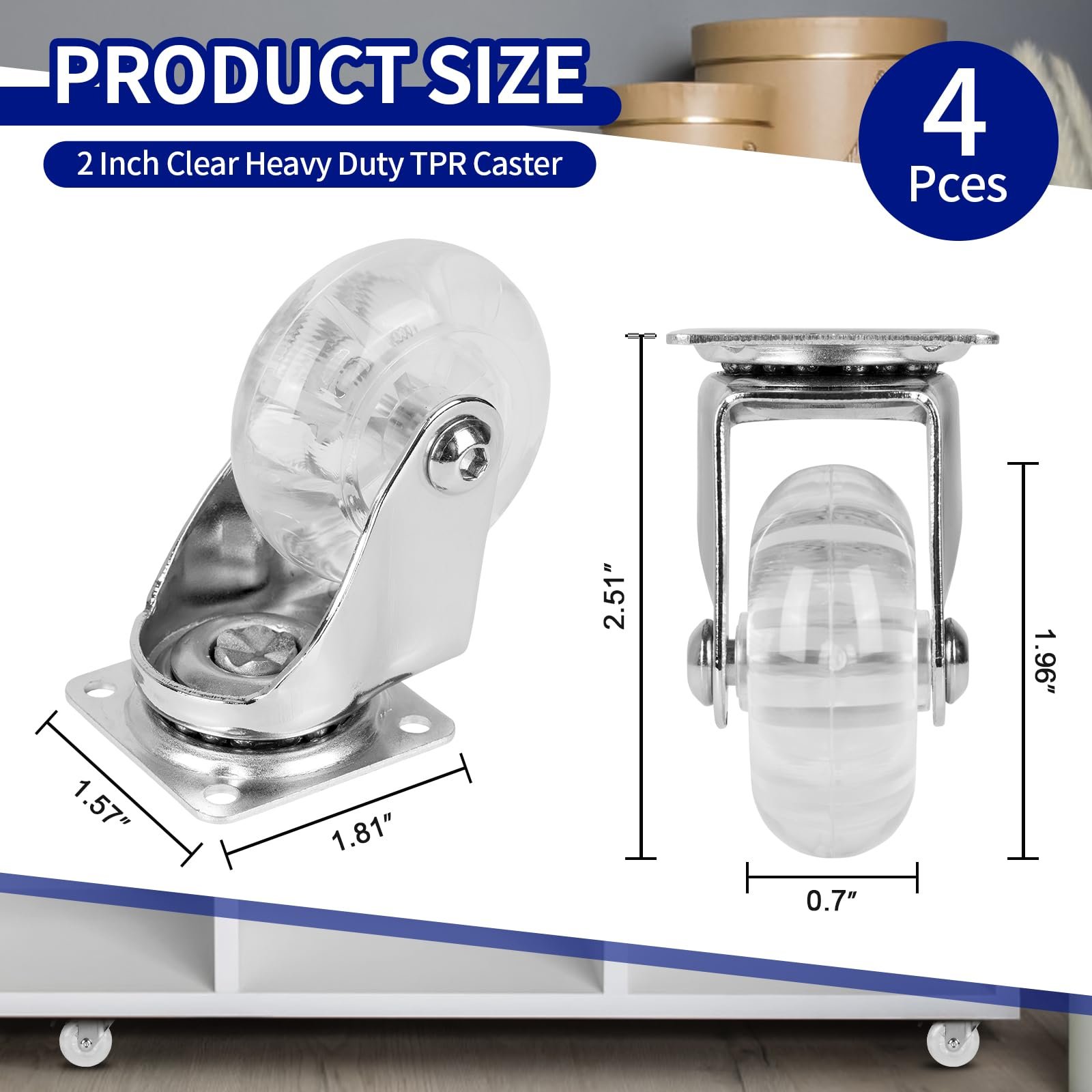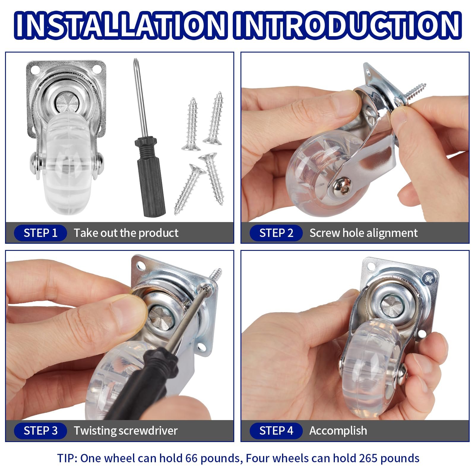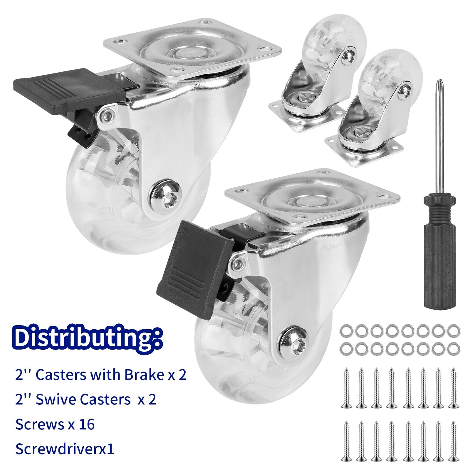 - Premium PU Material: Set of 4 caster wheels, 2 inch clear PU swivel caster wheels(2 swivel with Brake & 2 swivel without locking), a box with 16pcs M4 pointed screws and 1 pc screwdriver.