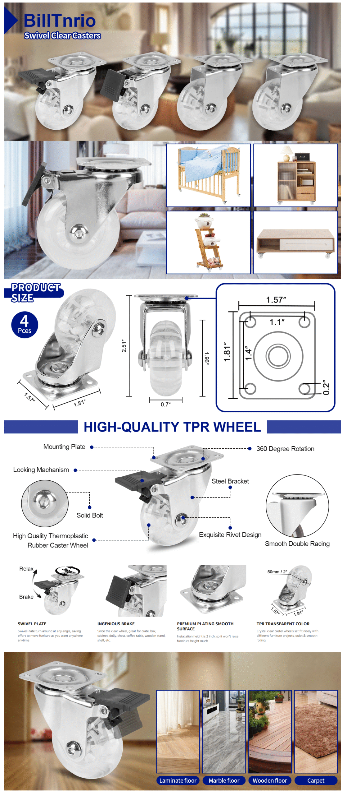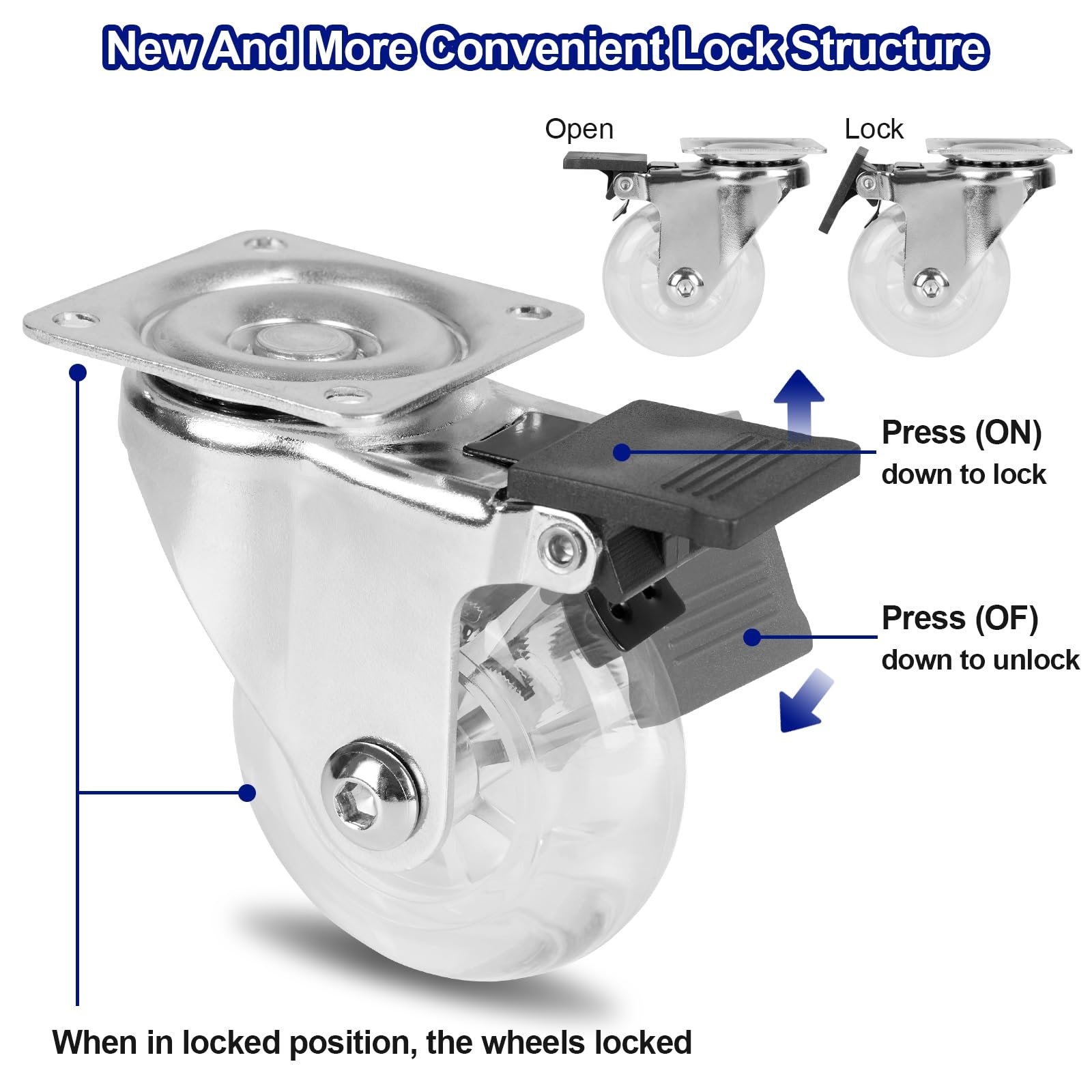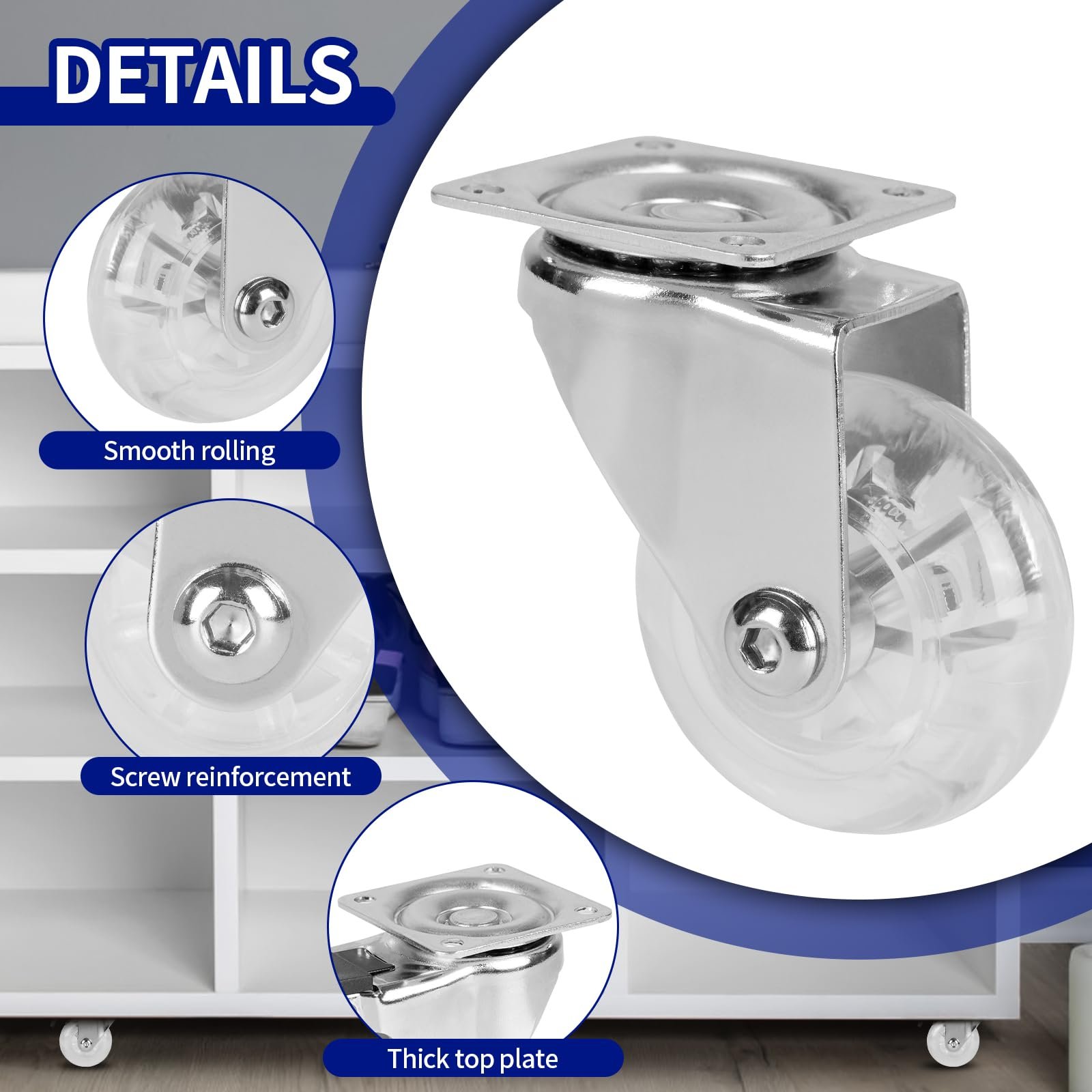 - Premium PU Material: Set of 4 caster wheels, 2 inch clear PU swivel caster wheels(2 swivel with Brake & 2 swivel without locking), a box with 16pcs M4 pointed screws and 1 pc screwdriver.
