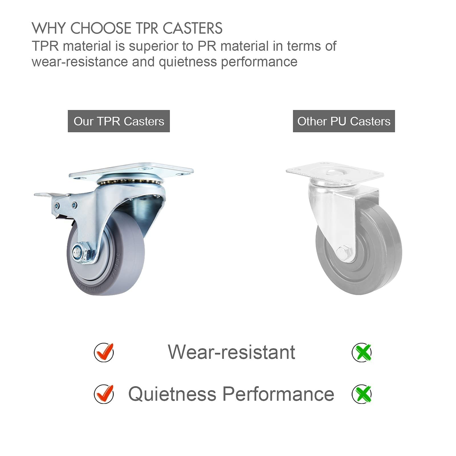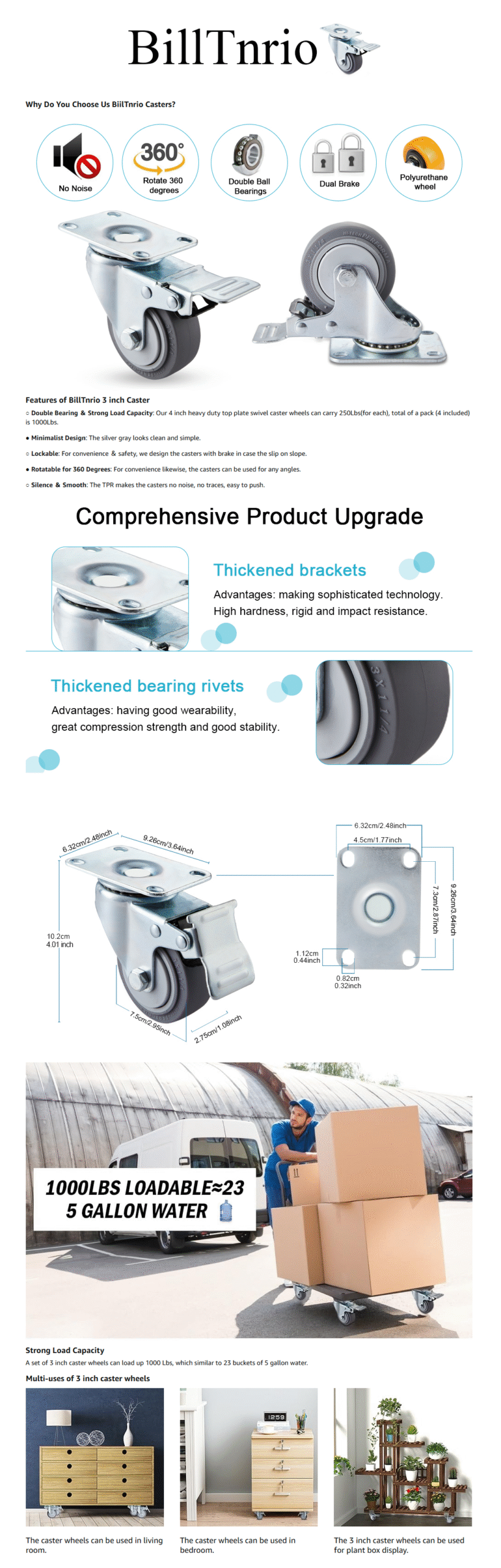 PREMIUM TPR MATERIAL: Our 3 inch heavy duty casters apply the thermoplastic rubber, different from other ordinary material as polyurethane rubber, are equipped with the abilities of shock & vibrations absorption which make the casters moving gently during the using process. Combined with the precise professional technology, our BillTnrio casters are smooth, quiet and non-marking.